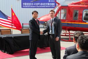 Bell Helicopter, a Textron Inc. (NYSE: TXT) company, today announced the delivery of a Bell 412EPI to Chongqing General Aviation (CQGA). The helicopter is the first certified Bell 412 type aircraft to operate in China and will be used for fire-fighting missions. A delivery ceremony was held at Bell Helicopter’s customization and delivery center in Piney Flats, Tenn. on April 22.
