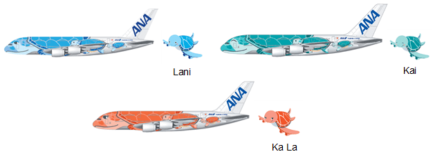In March 2017, ANA announced the special livery motif FLYING HONU. At the time, the design ANA introduced was blue, an homage to the Hawaiian blue sky. Today, ANA is pleased to announce two more colors, green and orange. The emerald green is inspired by the crystal clear waters of the Hawaiian ocean and orange is a reference to the beautiful Hawaiian sunset.In order to make this triad, the FLYING HONUs, more familiar to everyone, ANA has created a character from each aircraft. The blue character is named “Lani,” meaning sky, while the emerald green character is named “Kai,” meaning ocean, and the orange character is named “Ka La,” from the Hawaiian word meaning sunset.