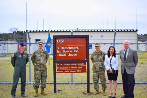 Team commemorating improved Joint Tactical Ground Station (JTAGS) installation in Japan, from left: Col. R. Scott Jobe, commander, 35th Fighter Wing, Misawa Air Base, Japan; Capt. Lee Schroeder, commander, Delta Detachment, 1st Space Company, JTAGS, Japan; Sgt. 1st Class Alfredo Lozano, Jr., detachment sergeant, Delta Detachment, 1st Space Company, JTAGS, Japan; Hoda Phillips, JTAGS program manager, Northrop Grumman; Craig Bergquist, director, JTAGS Product Office, Missile Defense and Space Systems, U.S. Army Space and Missile Defense Command
