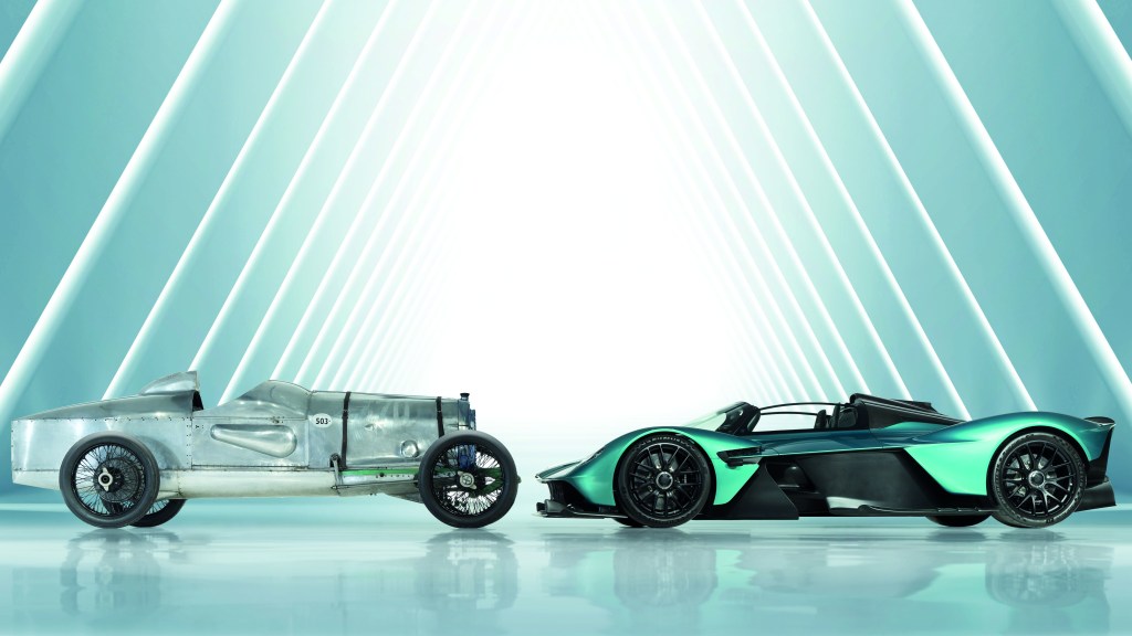 One of the brand’s oldest surviving racing cars, the record-breaking 1923 racer Razor Blade is pictured alongside the uncompromising Aston Martin Valkyrie hypercar.